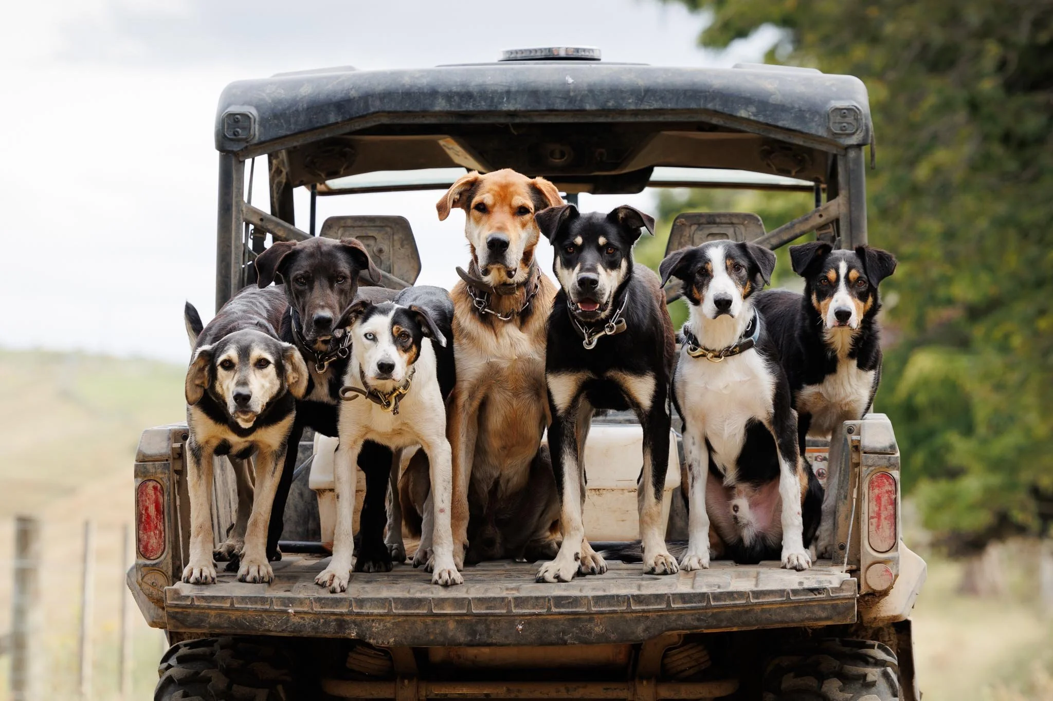 Individual portraits that show their character - the scarred-up old Huntaway with the grey muzzle who deserves the hero shot. The whole team on the back of the ute, muddy and satisfied after a good day's work.